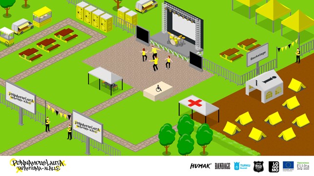 Toimintamallin toteutuksessa haluttiin hyödyntää hankkeen teeman mukaisesti tapahtumaympäristöä. Tämä toteutettiin festivaalialuekarttana, johon on upotettu jokainen hankkeen toimenpide omaan kohtaansa. Numeroitujen toimenpiteiden alta löytyvät niihin liittyvien toimintojen kuvaukset, vaiheessa hyödynnetyt materiaalit sekä työkalut toteutuksen avuksi.