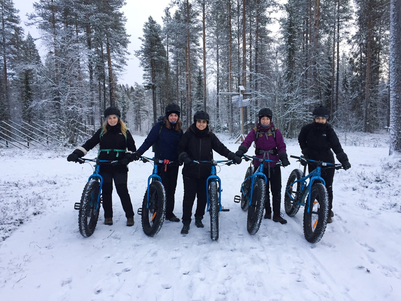 Ryhmä lämpimästi pukeutuneita ja hymyileviä naispyöräilijöitä seisoo talvisessa luonnossa pyöriensä vierellä Ylläksellä. Ympärillä hakupuita, puuaita ja lumenpeittämä pyörätie. Millaisia vaaratekijöitä pyöräily talvisessa luonnossa sisältää?