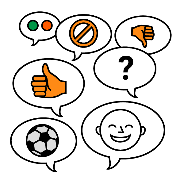 : Piirrettyjä puhekuplia, joiden sisällä on erilaisia asioita. Yhden sisällä on hymyilevät kasvot, toisen puhekuplan sisällä on jalkapallo ja kolmannen sisällä on peukku ylöspäin. Puhekuplissa on myös peukku alaspäin, vihreä ja oranssi pallo, kysymysmerkki ja kieltomerkki. Vuorovaikutusta voi rakentaa käyttämällä erilaisia vuorovaikutuksen resursseja. Kuva: Papunet-kuvapankki, Kuvako-hanke.