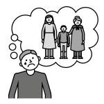 Piirretty hahmo itkee. Hänen päällään puhekupla, jonka sisällä on kolme eri kokoista hahmoa. Jatkuva huoli läheisistä on kuormittavaa mielelle. Kuva: Papunet-kuvapankki, Kuvako-hanke.