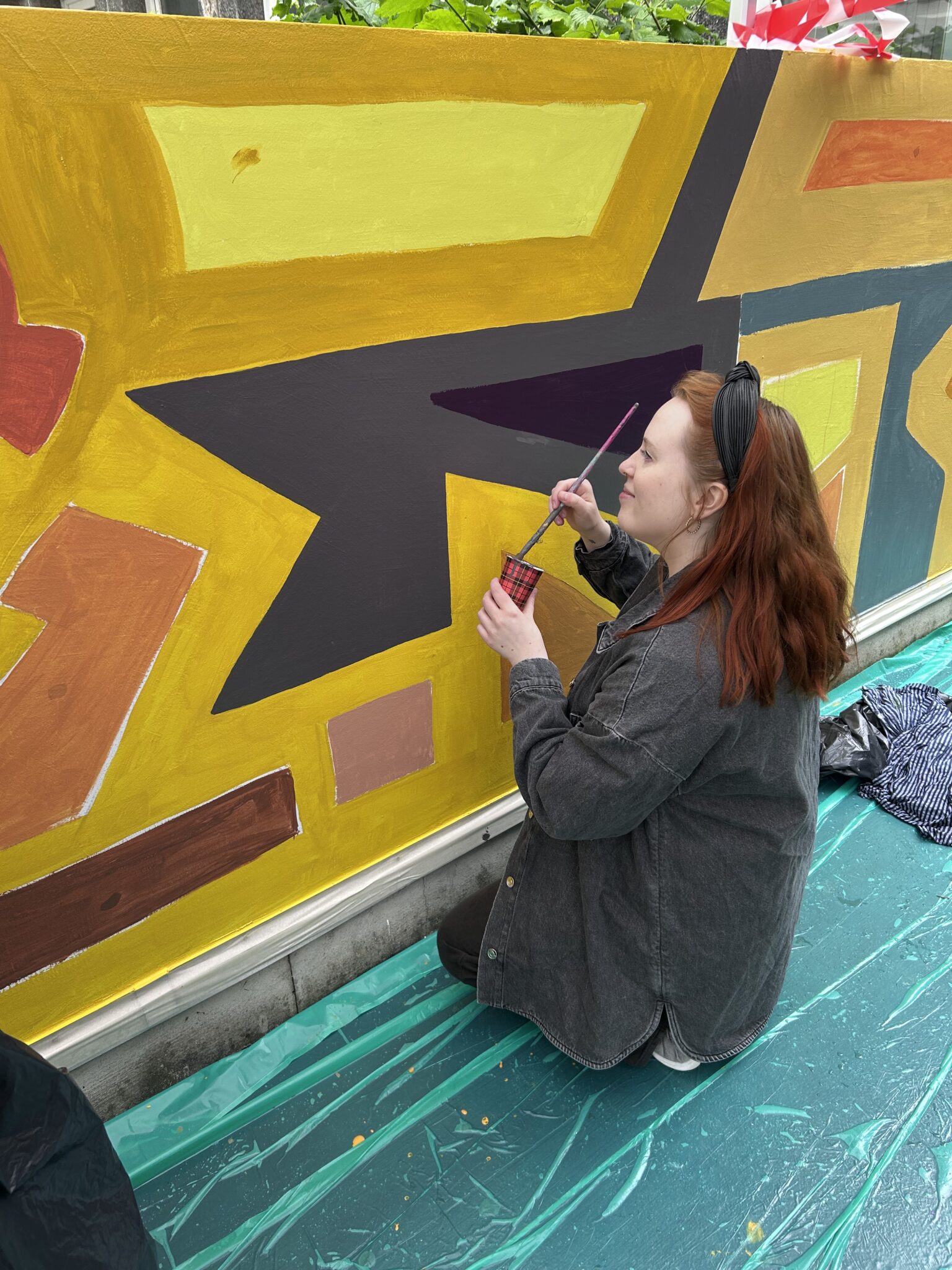 Kuvassa nainen kyykyssä maalaamassa seinään muraalia. Yhteisöpedagogi Saara Karttunen maalaa muraalia Pariisin yliopistolla toukokuussa 2025.