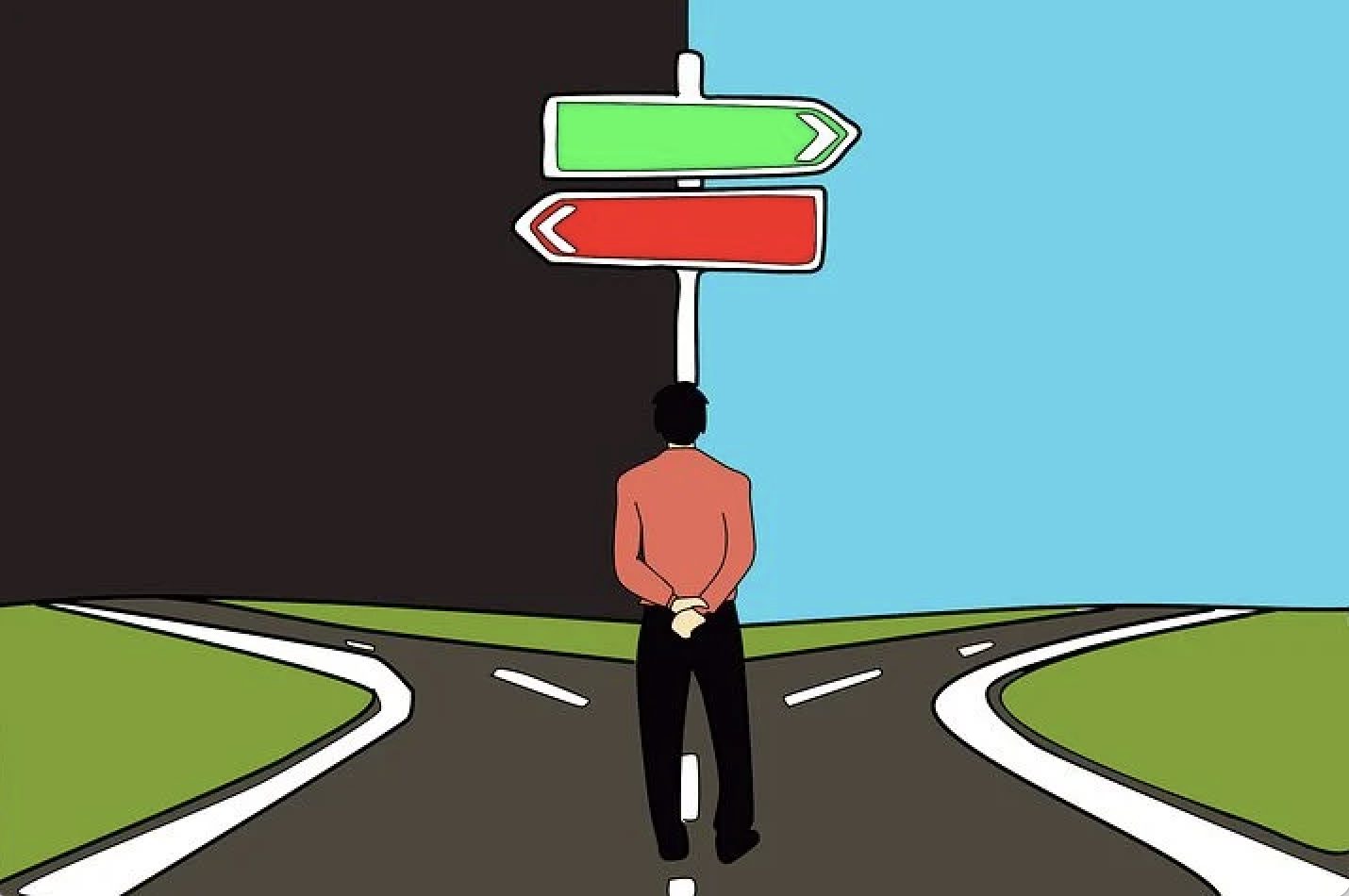 Piirroskuva, jossa selin oleva henkilö tuijottaa tienristeystä, jossa punainen kyltti vasemmalle ja vihreä oikealle. Opiskelijan ammatinvalinnan vaikeuttaa voidaan helpottaa alaa esittelevän valintakoekurssin avulla.