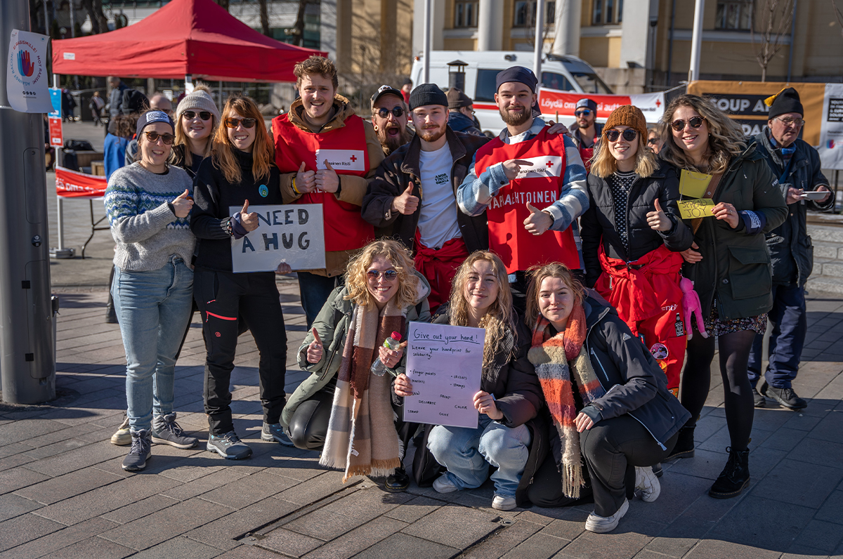 Humakin kansainvälisen kumppaniverkoston opiskelijoita Punaisen Ristin ja Humakin järjestämässä Soppaa ja solidaarisuutta -tapahtumassa Turun Torilla maaliskuussa 2023. Kuva: Anssi Uusitalo, @anssicasanova