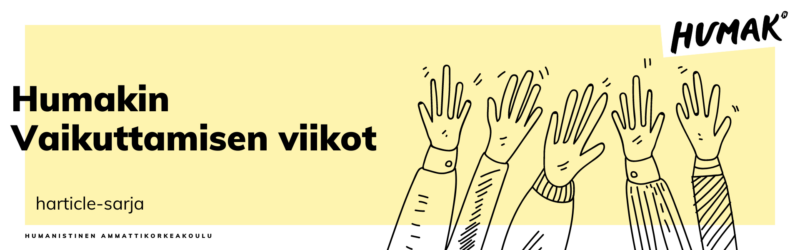 Vaikuttamisen viikkojen aikana julkaisemme humakilaisten kirjoittamia harticleja vaikuttamisesta eri näkökulmista. Kolmatta kertaa järjestettävien vaikuttamisviikkojen teemana on yhteiskunnallinen vaikuttaminen. Tavoitteena on innostaa humakilaisia osallistumaan aktiivisesti ja tunnistamaan, miten omalla panoksellaan voi vaikuttaa korkeakouluyhteisöönsä ja ympäröivään yhteiskuntaan.