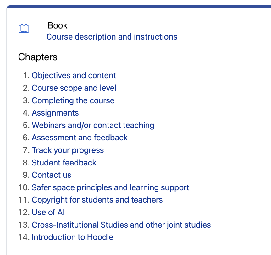 Kuva 1. Verkko-opintojakson ohjekirjan mallipohjat toteutettuna Open LMS (Moodle) kirja-aktiviteetilla suomen (yllä kuva) ja englanninkielisille opintojaksoille (alla kuva).