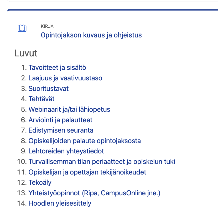 - Opintojakson vastuuhenkilöt, kanavat ja aikataulut löytyvät Tervetuloa-sivun opintojakson kuvaus ja ohjeistus -kirjasta (98 %).