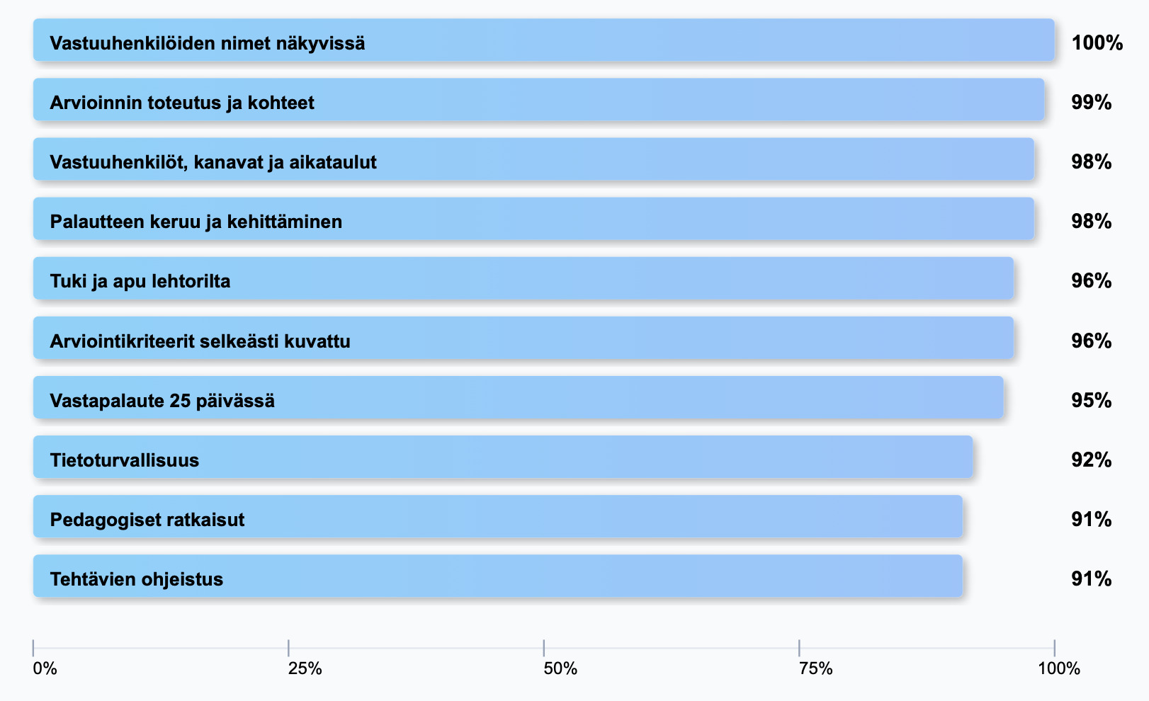 - Arviointikriteerit on kuvattu selkeästi osaamistavoitteisiin peilaten, ja ne ovat avoimesti nähtävillä opintojakson kuvaus ja ohjeistus -kirjasta (96 %).