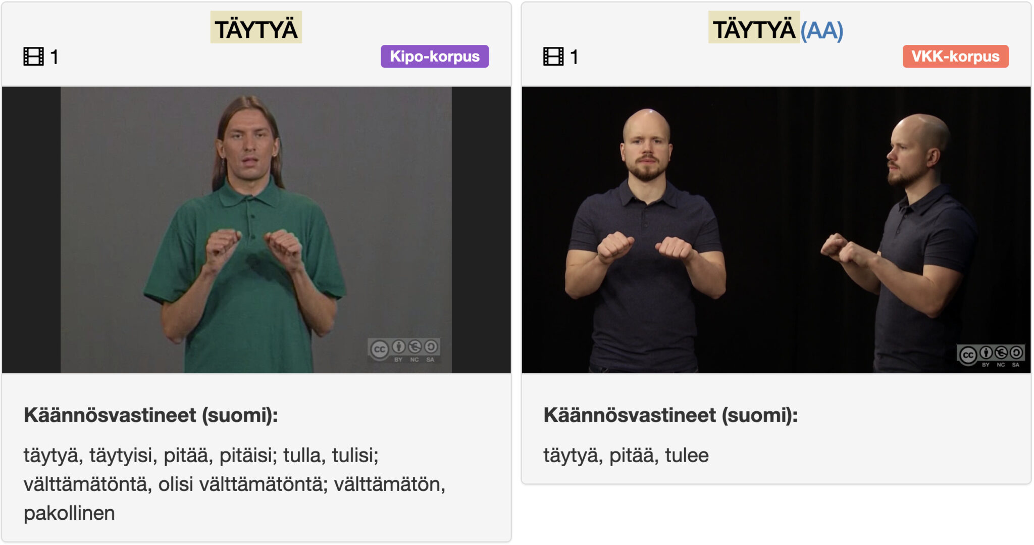 Kipo-korpuksessa viittoman TÄYTYÄ ID-glossi on TÄYTYÄ, VKK-korpuksessa TÄYTYÄ(AA). Kuvakaappaus Signbankista.