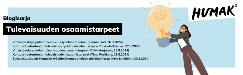 Tämä on Humakin toimialojen tulevaisuutta käsittelevän blogisarjan ensimmäinen osa. Blogit perustuvat Humakin opiskelijoiden harjoittelupaikoillaan tekemiin 580 asiantuntijahaastatteluun vuosien 2021–24 välisenä aikana. Haastateltavat olivat yhteisöpedagogi- ja kulttuurituotantoalan johto- ja asiantuntijatehtävissä toimivia henkilöitä. Blogisarja on viisiosainen ja siinä julkaistaan seuraavat osat: