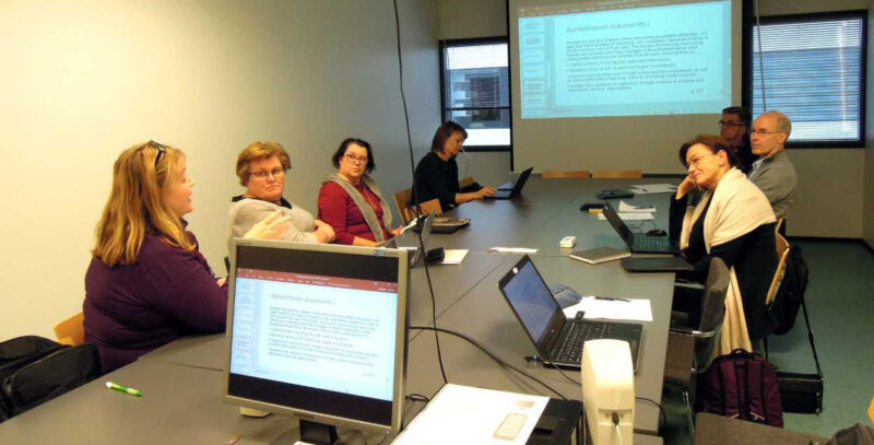 Kuvassa: vasemmalla lähinnä kameraa Suvi Lappalainen (Osaamiskeskus Kanuuna), Sirpa Syrjä (Kirkkohallitus), Soili Lehtiniemi (Seurakuntaopisto) ja Sari Virkkala (Centria). Oikealla kameraa lähinnä Minna Valtonen (Diak), Pekka Penttinen (XAMK) ja Juha Nieminen (TAY).