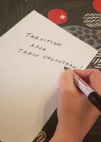 Paperi, jossa lukee teksti “Tarvitsen apua takin valintaan”. Kirjoittaminen on helppo keino varmistaa viesti. Kuva: Hanna-Kaisa Turja.