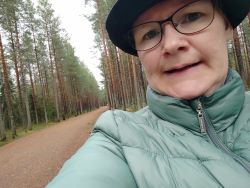 Hiekkatiellä kulkeva nainen lähikuvassa, hattu ja vihertävä takki, Liisa Mertala. Liisa Mertala selfie.