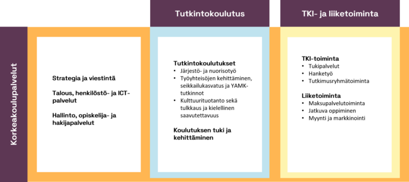 Toimimme tiiviissä yhteistyössä kumppaneidemme kanssa ja jaamme yhteisen tavoitteen kehittää koulutusalojemme osaamista. Organisaatiomme jakautuu kolmeen tulosalueeseen: korkeakoulupalvelut, tutkintokoulutus sekä TKI- ja liiketoiminta.